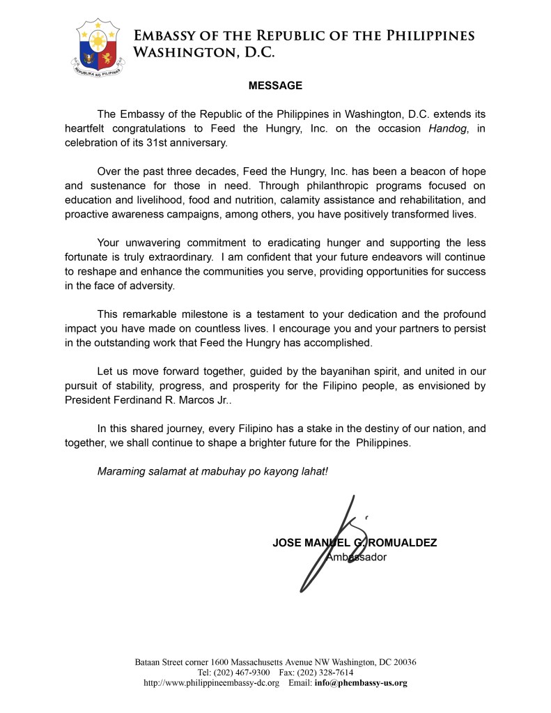 A Message from Ambassador Jose Manuel Romualdez at the Handog 31st Anniversary Souvenir Program