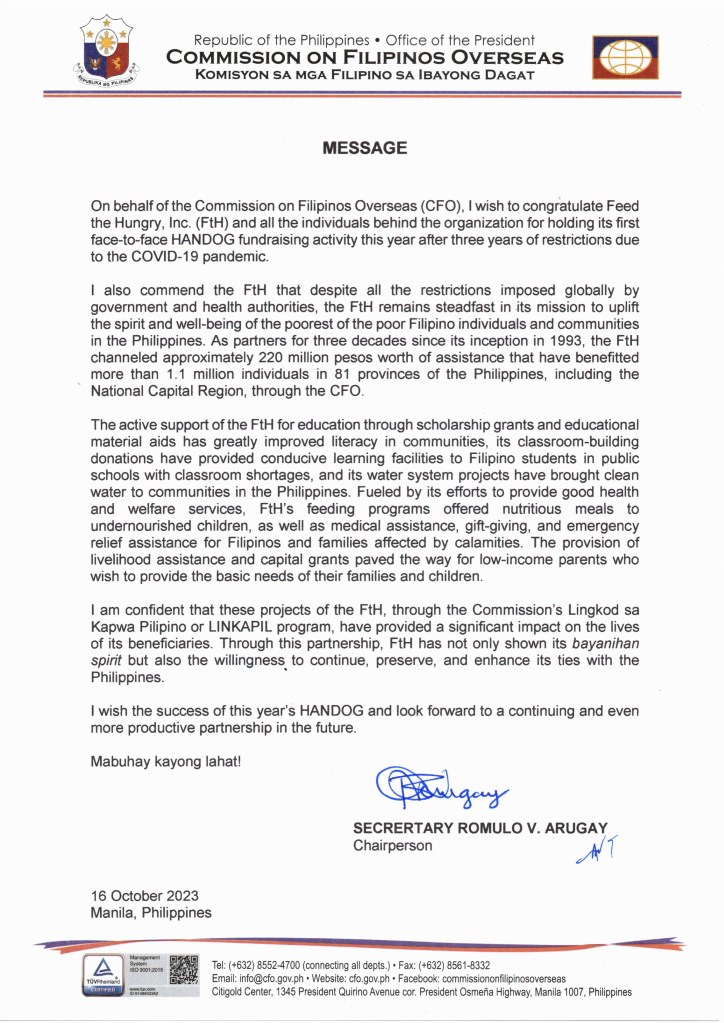 A Message from Sec. Romulo Arugay of Commission on Filipino Overseas at Handog 31st Anniversary