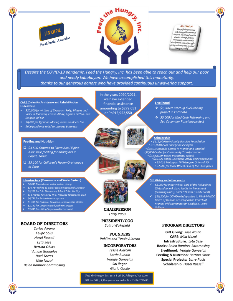 Feed the Hungry, Inc. (FtH) is a 501(c)(3) tax exempt, non-profit charitable organization based in Washington, D.C. Started in 1992 and officially incorporated in 1993, FtH is wholly volunteer-driven and started as a gift giving and feeding project for indigent children in the Philippines by a group of World Bank Group and IMF (International Monetary Fund) Filipino staff and joined by Filipino-American volunteers in the community.