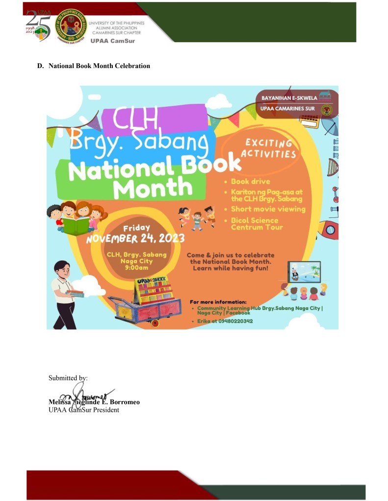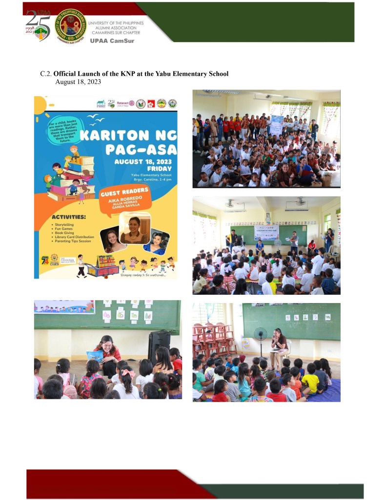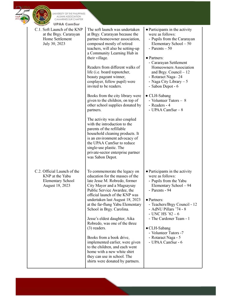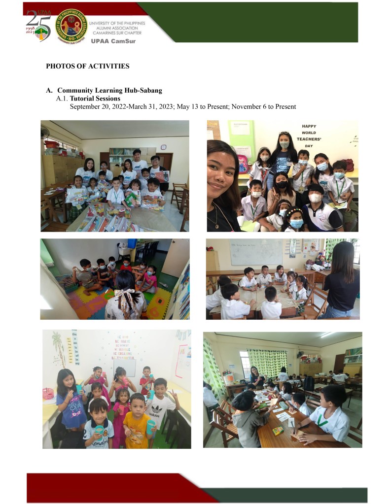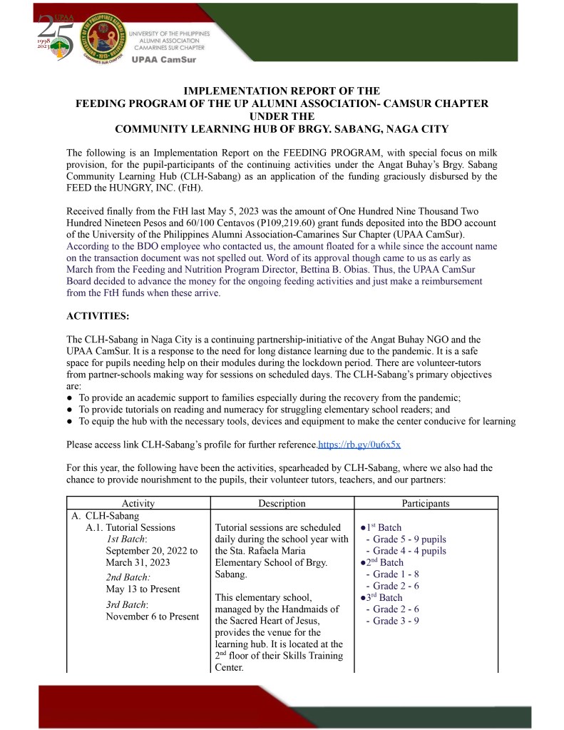 IMPLEMENTATION REPORT OF THE FEEDING PROGRAM OF THE UP ALUMNI ASSOCIATION- CAMSUR CHAPTER UNDER THE COMMUNITY LEARNING HUB OF BRGY. SABANG, NAGA CITY