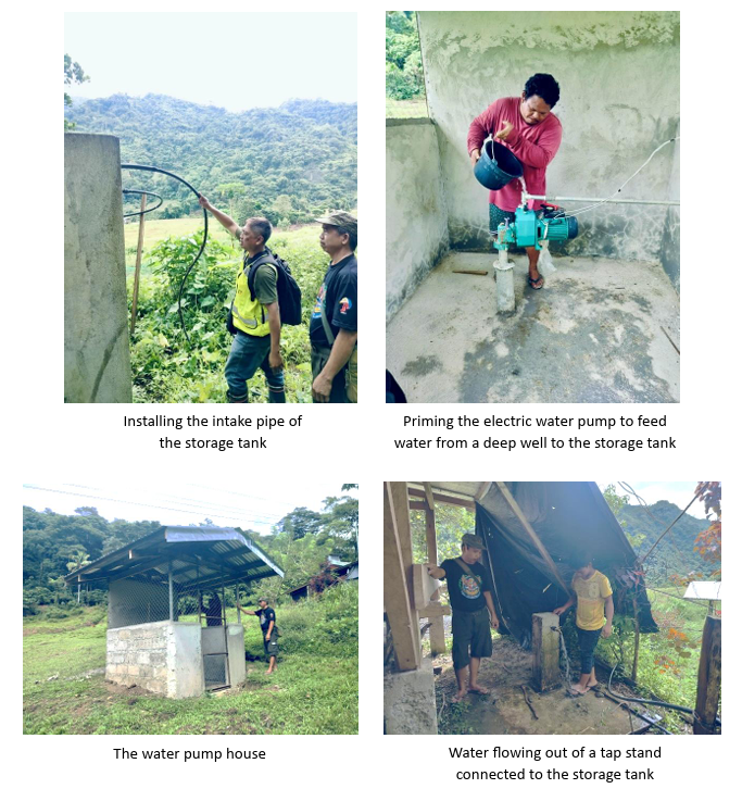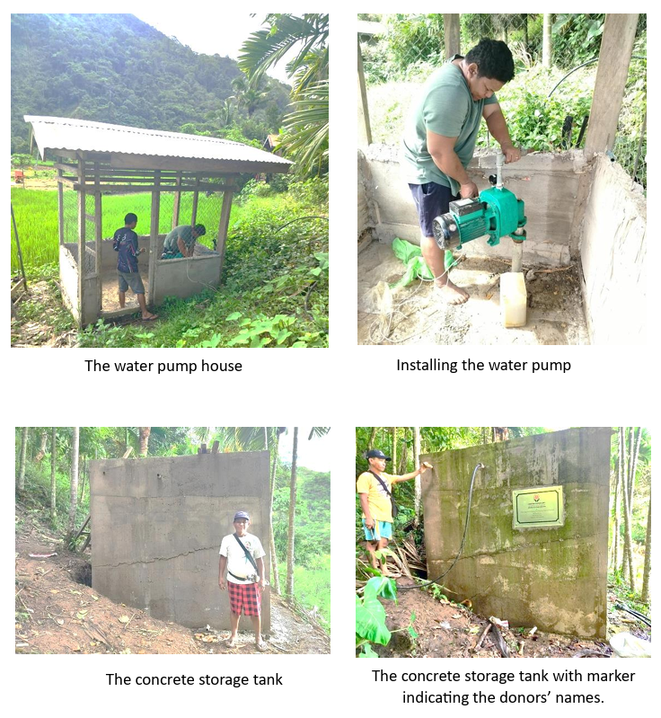 - The electric water pump system, as previously reported, has been completed, and the community has been enjoying an ample water supply for household and farm use. The connection to the local electric cooperative was facilitated by the barangay council, which also pays the monthly utility bills.
